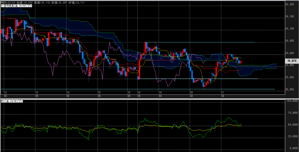 ドル建て | 長期は並行であるが、ゴールデンクロスし、買い回転中の押し目場面。 三役好転を見せ、上昇雲へのねじれを見せる展開も、16,000円を維持できていない。 |