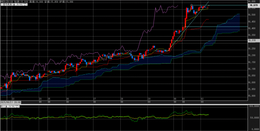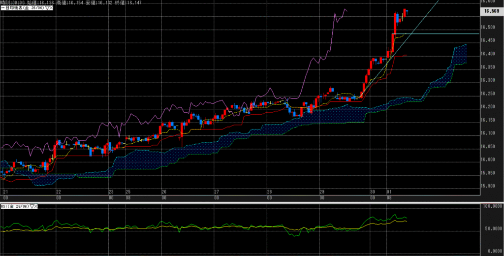 円建て | 16,430(転換線・MA短期線)~想定困難 ドル円が動意薄、ドル建てが強い状況であり、レジスタンスを想定するのは困難である。 但し、転換・MA短期からの乖離は気になるところで、一定の押しは警戒すべきと考える。 |