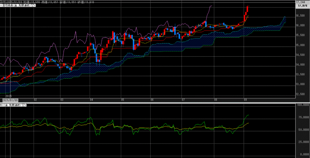 ドル建て | 3,530~3,550ドル現状のレンジ、押すならば転換・基準線の中値の3,515ドル 史上最高値をさらに更新するも、3,540ドル付近はレジスタンスとなっている、もしくはそれ以上にあげる理由がない? 明らかな急上昇により、押し目を警戒すべきだが、転換線・MA短期線付近に位置しており、RSIも高値圏からは抜けつつある。 一方で、日足は転換線・MA短期線からの乖離が目立ち、RSIもかなりの高値圏である。 |