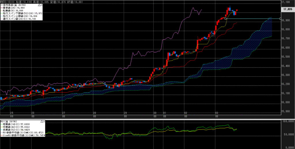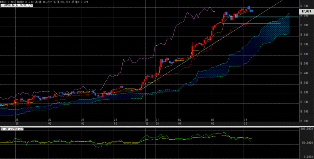 円建て | 16,970(現状レンジ下限、転換・基準線の中値)~想定困難 日足は、RSIも転換・基準線からの乖離から見ても、明らかな行き過ぎ感があり、時間足は一目もMA平均足のいずれも押し目をつける感があり。 |