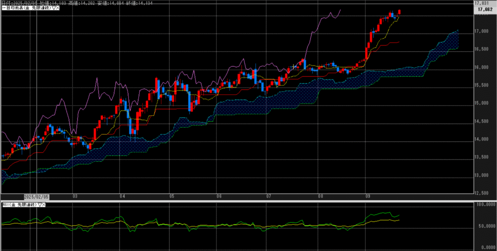 弱い時間帯に入る可能性も考えたが、結局は史上最高値を更新する流れ。RSIは高値圏とも言えるが、上げ余地は十分である。