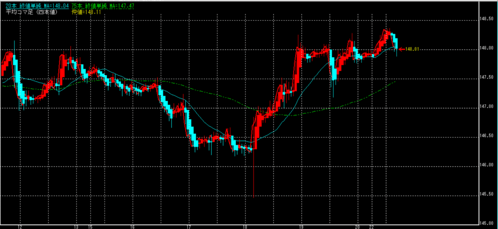 高値圏内での推移であるものの、目先レンジ上限の149円を見るまでも無く、売られる流れ。円安基調であるが、買い進むほどの理由は無いと言ったところか。