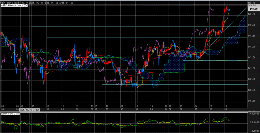 遂に149円を上抜け、150円を目指すも、大きなキリ番であり売り注文が警戒されるところであると思われる。