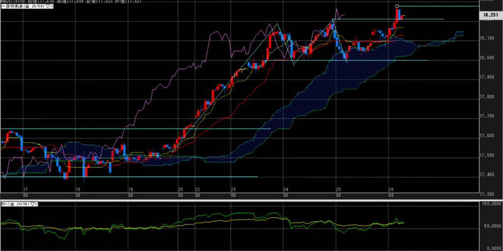 一目均衡表 | 昨日の高値付近からの陰線となっているが、下ひげであり、弱気転換したとは思えず。 |