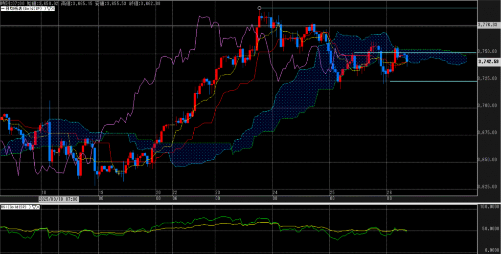 値位置 一目均衡表中心 | 雲の上部を彷徨い、脱出するも上髭であり、回復するとしても時間は掛かる様には見える。 |