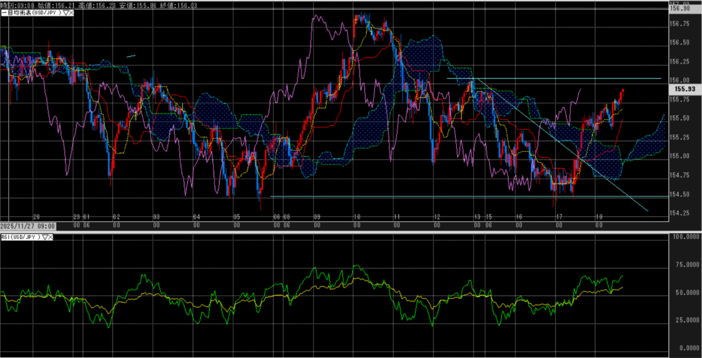 ドル円は154円台に下押しする場面があったが、日銀会合前のポジション調整や円キャリー期待を背景に155円台後半まで買い戻しが優勢となった。円高材料は、日銀利上げ観測、株安によるリスク回避、米雇用統計で失業率が上昇し労働市場の冷えが意識された点である。円安材料は、米長期金利の高止まり、日銀の「その先」が不透明との見方、155円割れでの押し目買い観測である。