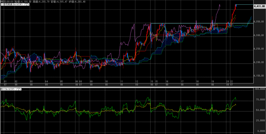 日足は史上最高値を更新して、RSIも75%、時間足は、80%を超えており、行き過ぎ感が高まりつつある。MA平均足について、日足はともかく、時間足はMAとの乖離がエグい。転換線の4,380ドル程度の押しが必要と思われる。