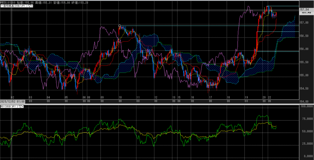 ドル円は先週末の日銀会合後に進んだ円安の反動から、東京時間は調整色の強い動きとなった。157円後半まで上昇した水準では過熱感が意識され、午前中にかけて利益確定のドル売り・円買いが入り157円前半へ下押しした。ただ、円債利回りの上昇や追加利上げ観測の後退といった構図自体に変化はなく、157円割れを試すほどの勢いは見られない。クリスマス週で市場参加者が減少する中、方向感は乏しいものの、高値圏での持ち合いが続く局面といえる。