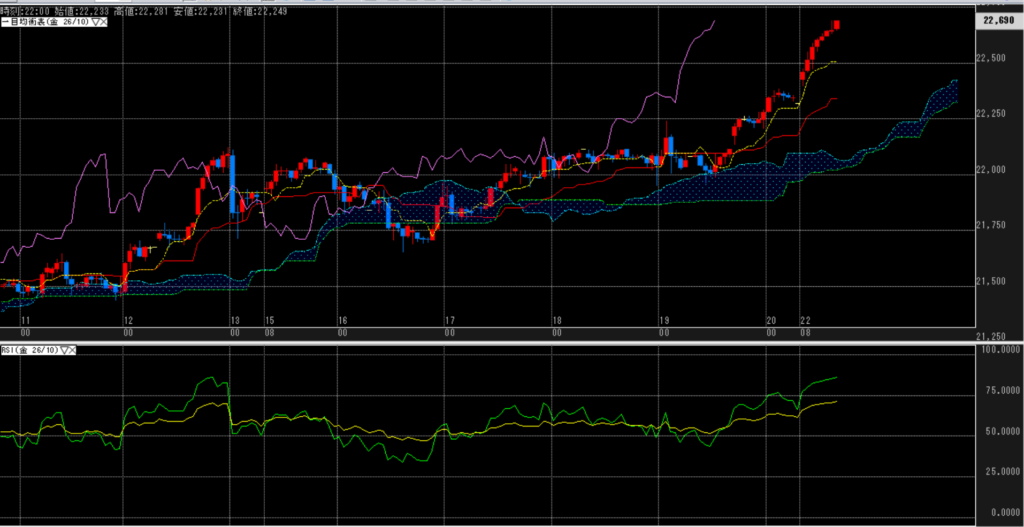 週明けは陰線をつけることなく、一方的な上昇。換算値においても、前回の高値の様な異常値ではない。単に各線との乖離、RSIの行き過ぎ感があるのみ。