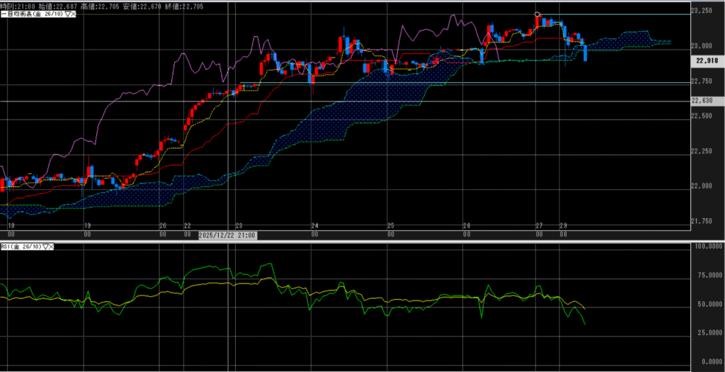 本日の東京タイム寄付きでドル建ての利食いに合わせた下落→戻し、終値付近で再び、利食いが出ていると思われ、さらに継続するかは微妙だが、雲は下抜けている。