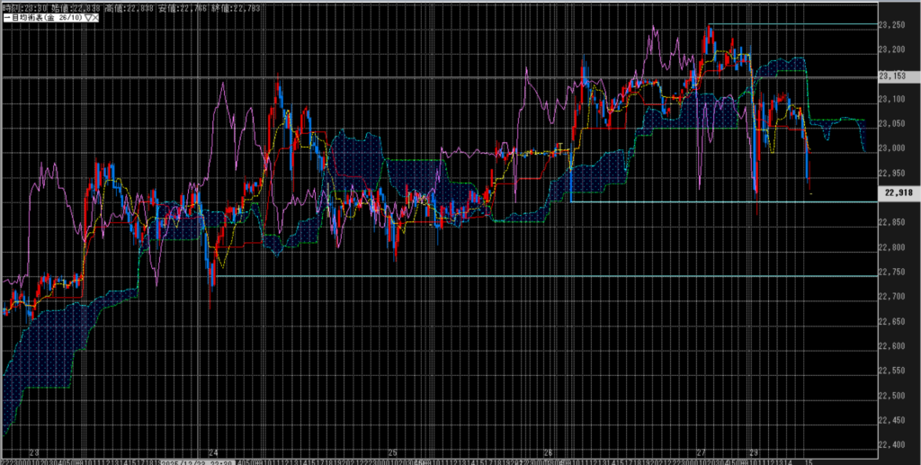 日足では転換線との乖離を埋めるどころか、下抜き基準線まで到達。史上、稀に見る大陰線を形成。時間足で見れば、欧州タイムで弱含み、さらにNYタイムで加速し、朝方は下げ止まるも、雲の下で更なる下落は否定できない形。