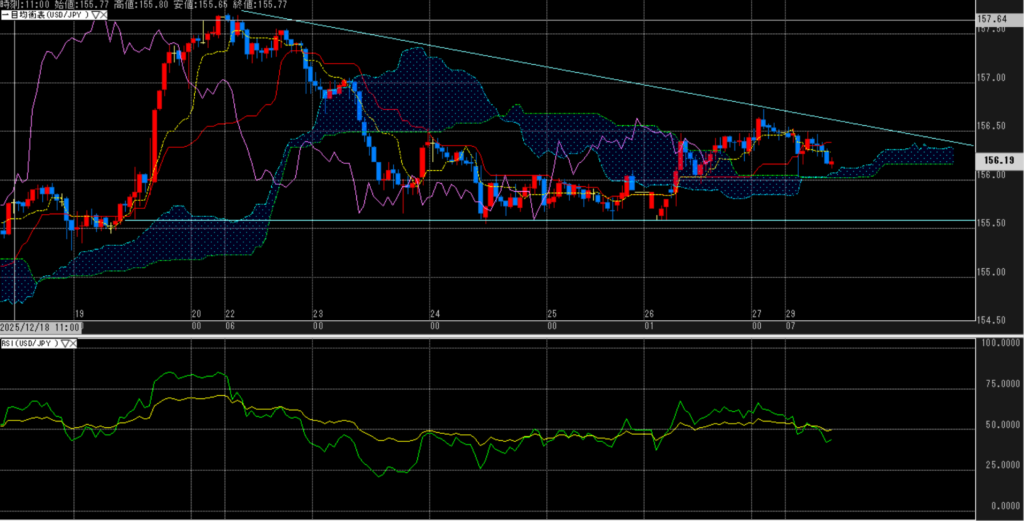 ドル円は朝方に日銀の「主な意見」を受けて一時156円前後まで円高に振れたが、その後は反発し往って来いの展開となった。会合では追加利上げに前向きなタカ派的意見が目立ったものの、先週発表された東京都区部CPIの伸び鈍化を背景に、利上げ期待は限定的との見方が根強い。円安けん制を続ける日本当局の姿勢が上値を抑える一方、年末の薄商いの中で新規材料に乏しく、積極的な方向感は出ていない。市場は様子見ムードが強く、156円台を中心としたレンジ取引が続いている。