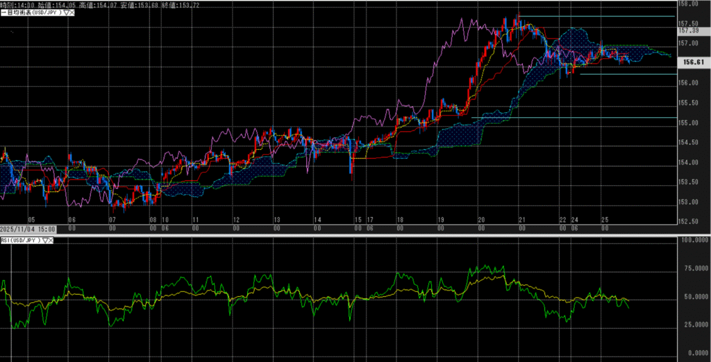日足:三役好転は維持し、転換線との距離はあり、157円手前で一時休止。