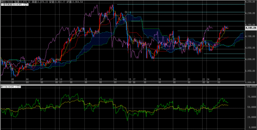 時間足_値位置(一目均衡表):サポートよりも、レジスタンスの方が多く見える中、上昇し、三役好転。しかし、4,150ドルへの反応は鈍いと感じる、