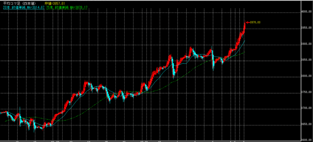土曜日朝から300円以上の窓を開けて、さらに上昇する流れ。後半は失速するも史上最高幅の値動きである。