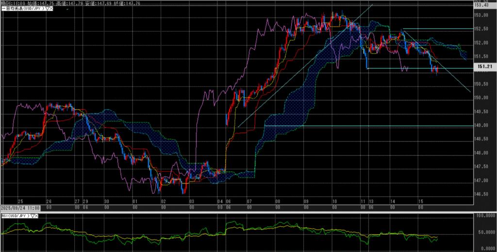 ドル円は米中対立や日本政局の不透明感を背景に上値の重い展開となった。パウエルFRB議長が量的引き締め(QT)の停止を示唆し、労働市場の弱さに配慮する姿勢を示したことでドル安圧力が強まった。ドル円は一時150円90銭付近まで下落。高市氏の自民総裁選勝利で広がった円売りポジションの巻き戻しも進み、「高市トレード」は一服した。さらに中国人民銀行が人民元基準値を7.0995元と昨年11月以来の元高水準に設定し、ドル安/元高の流れが波及。米中摩擦では、中国が米国の造船関連企業に制裁を科すなど対立が再燃。地政学リスクとしてはガザのラファ検問所再開が伝わり、人道支援再開への期待が広がる一方、根強い緊張感が市場心理を圧迫している。ドル円は151円前半での調整を続け、米利下げ観測と米中関係の行方が今後の焦点となっている。