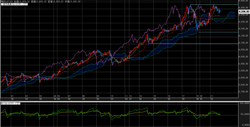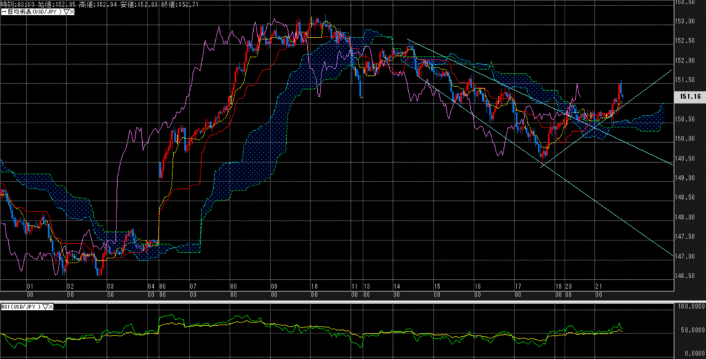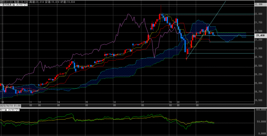 日足では転換線に支えられたが、トレードは漸次の大陰線の下部である。また、RSIも冷えたとは言え、高値圏は継続している。