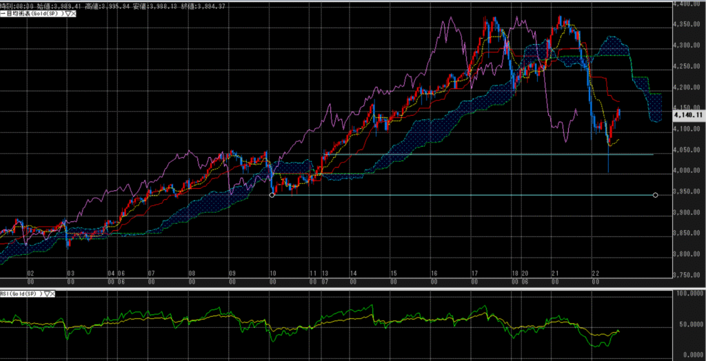 日足は長い下ひげとなったが、陰線の実体も長い。時間足レベルでは、一目では一服したとも取れなくはないが、期待が含まれる。