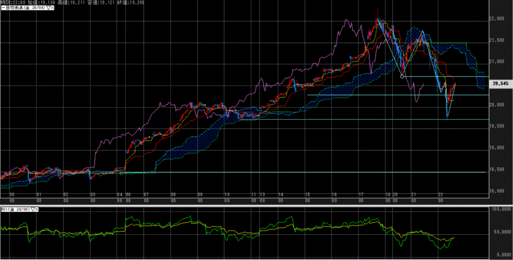 雲を大きくブレイク後、反転はしているが、各線は下向きである。