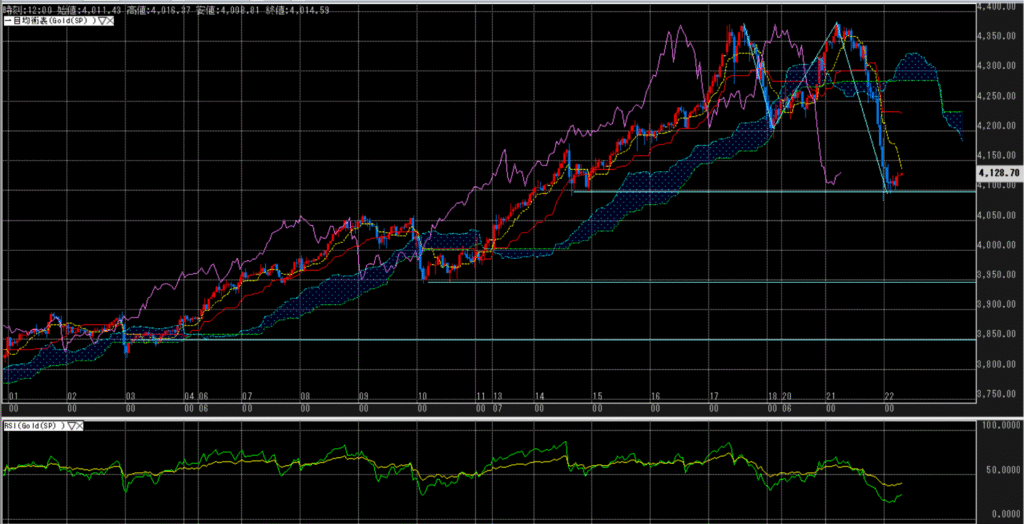 日足では特大陰線が発生、時間足でも雲を大きくブレイク、弱い時間に入ったと考えるべきか。