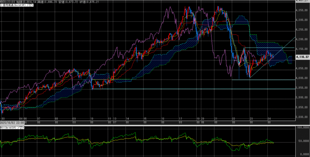 値位置(一目均衡表):弱い流れを断ち切るであろうレジスタンス付近、雲の中の推移。
