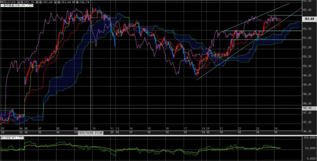 日足:目先レンジ150~153円へ、上限を試す展開だが、その前の152.50の時点でかなり重い。
