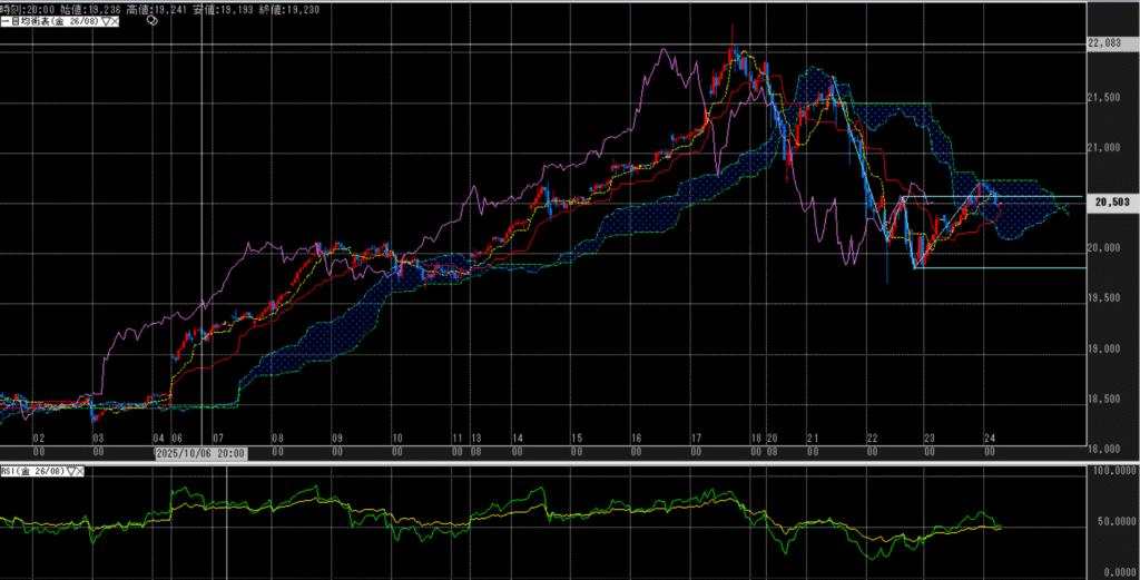 日足:特大陰線の下で、転換・基準線の仲値の推移が続く。