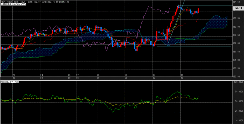 値位置(一目均衡表):日足については、目先レジスタンスの153円を突破、三役好転となり、雲も強い。但し、キリ番の155円は重くなる可能性はある。
