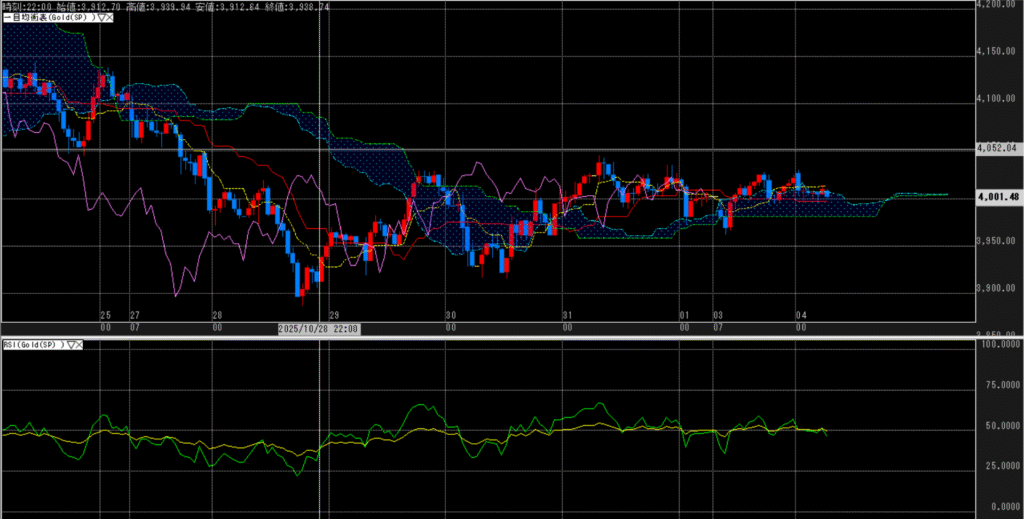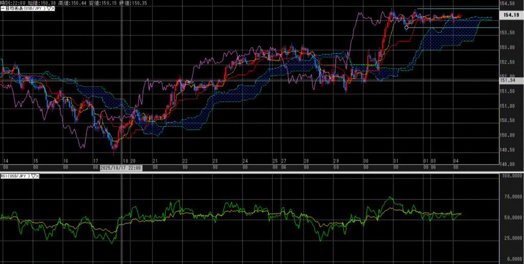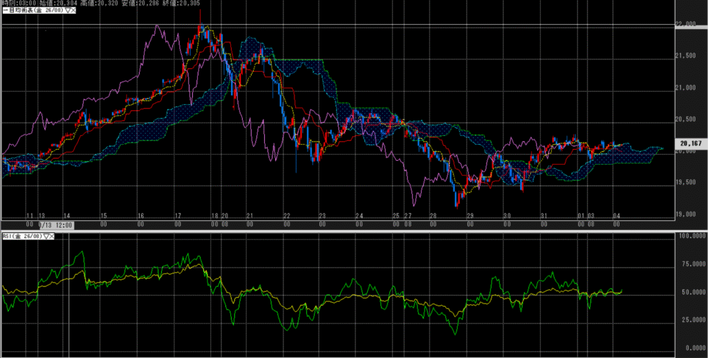 日足は基準線を割り込むが、戻り高値。しかし転換・基準線のデッドクロスが見えており、弱い時間帯か停滞気味の推移かの判断が難しい。