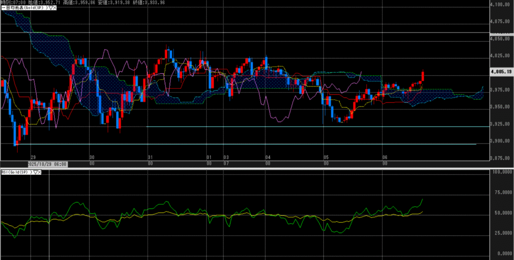 為替市場では、前日のドル高を受けて東京時間はドル安円高がやや優勢。ドル円は153円後半~154円前半でもみ合い。金は安値拾いの買いが続き、1オンス=3990ドル台を維持している。
