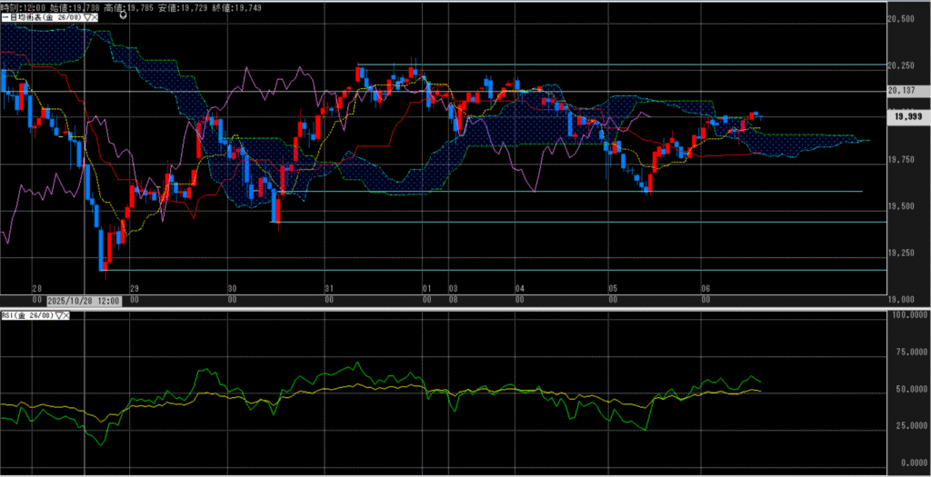 値位置(一目均衡表):20,000円台を回復も、所詮は大陰線3発目の上限にも満たない。時間足は各線の上に実体が出てきており、雲も上抜けしそうではある。しかし、月末からのレンジの中心値である。