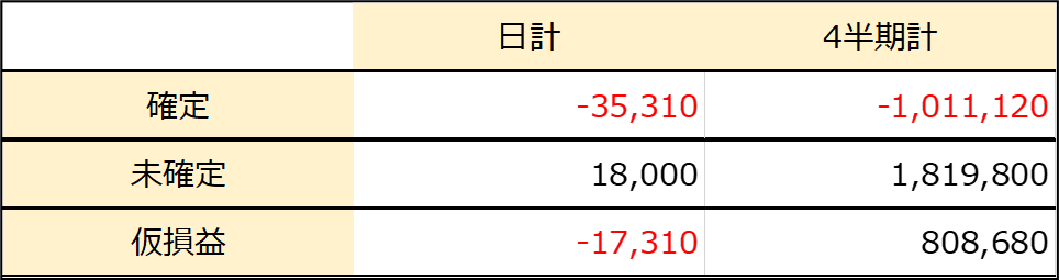 今月に入り、1度だけ微妙に儲けが出たのみ。大小で毎日、損失。