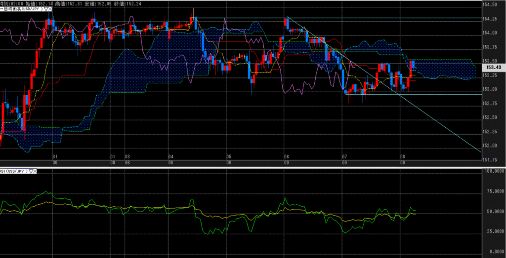 値位置(一目均衡表):153円はサポートされる様子で、雲の下で各線が強くなる。但し、154円前半を上抜けできるかは懐疑的。