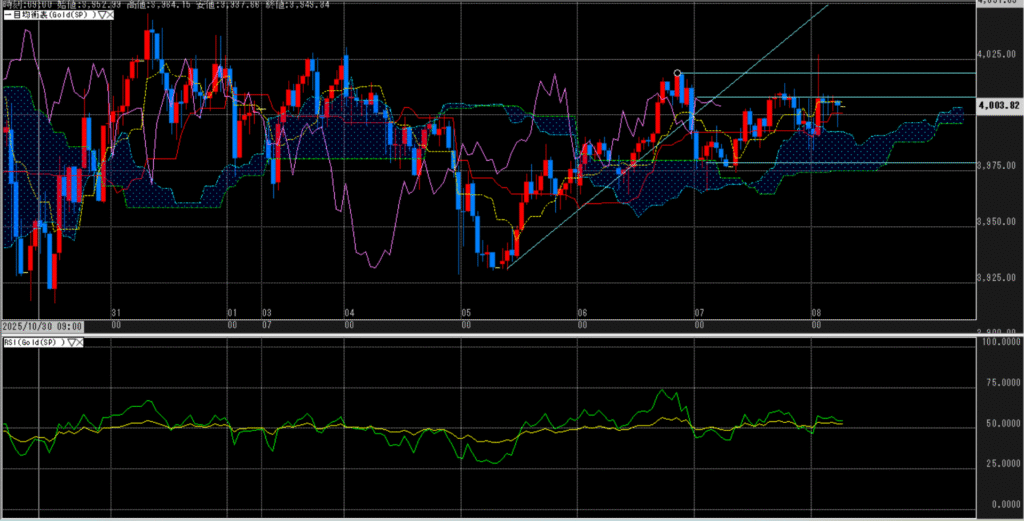 米政府機関閉鎖の影響で雇用統計など主要指標が発表延期となり、新規材料に乏しく伸び悩んだが、米株下落を受けた安全資産買いで下値は堅い。一方、ドル円は153円台後半で推移。先週から続くドル買い・円売りの流れが継続し、154円手前で上値を抑えられつつも地合いは強い。米金利低下によるドル安圧力と、日銀の利上げ慎重姿勢による円売り思惑が交錯しており、方向感は限定的。今週は米景気懸念や利下げ観測をめぐる思惑に加え、米政府閉鎖解除やCPI発表の有無が焦点。金は4000ドル台定着を試す展開、ドル円は153円台後半を中心に上値試しの攻防が続く見通し。
