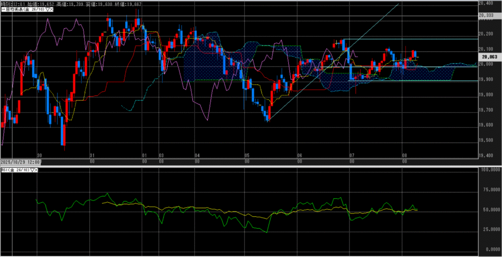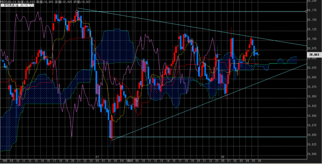 値位置(一目均衡表):転換線に支えられてはいるが、停滞期間が長く、基準線とも交差しそう。上伸する場面があったとしても、20,200~20,300円はかなり重く感じる。