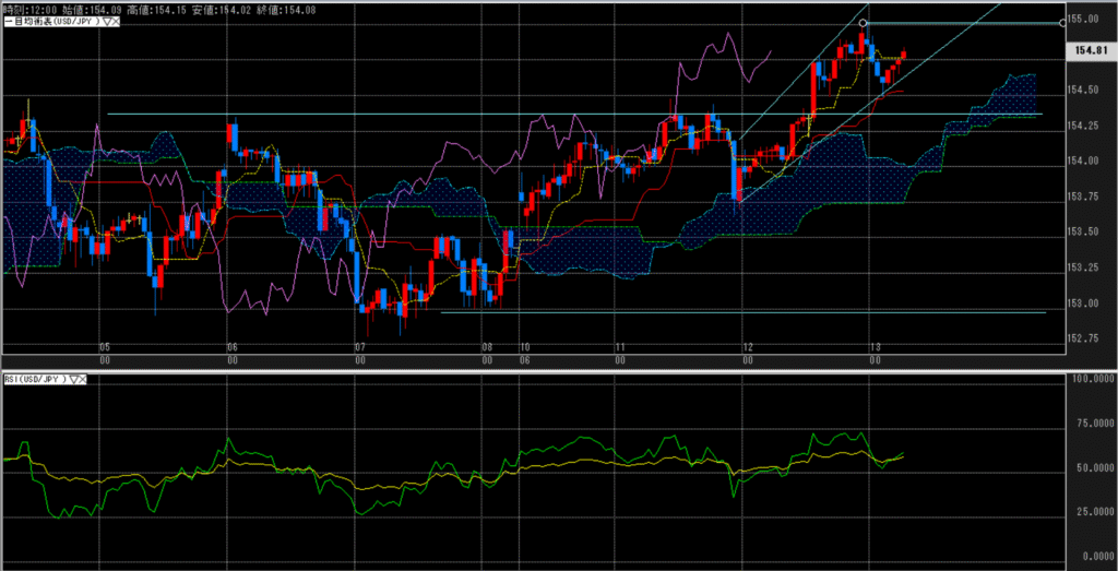 値位置(一目均衡表):三役好転が継続し、順調なアップトレンドと見られるも、155円が新たなレジスタンスとなるかに着目。