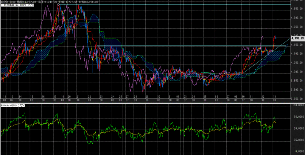 値位置(一目均衡表):4,150ドルはすんなりと突破し、日足では基準線の上に乗る。時間足は三役好転で、さらに各線は強く見えるが、乖離も目立ってきている。