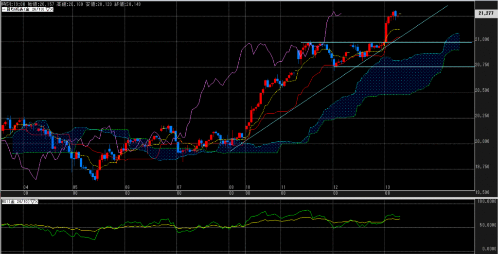 値位置(一目均衡表):日足は三役好転とはならないが、実体は基準線の上にのり、各線が上向き。時間足は三役好転としており、転換線からは大きく乖離しており、何らかの調整が必要と思われる。