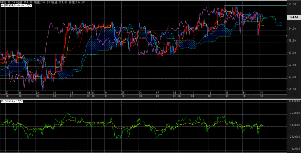 下位足で見た場合、155円の手前でも抵抗がある。FRBの利下げ観測後退や米金利上昇、日銀の利上げ後退といった要因はすでに市場に織り込まれており、新鮮味が薄れているため追加のドル買いは出にくい。