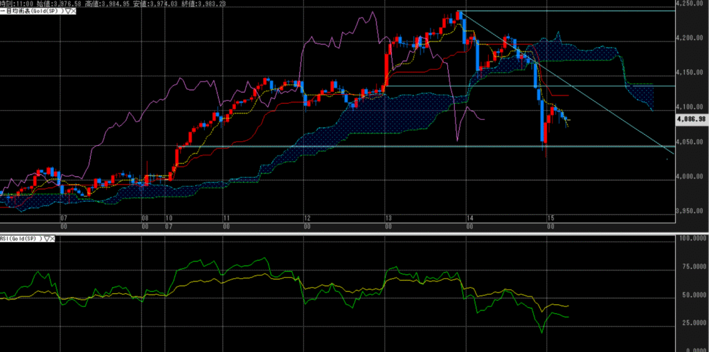 さらに下位足で見ても、ダウントレンドは否めず。4,150ドルが上値として重い展開が予測される。FRBの利下げ観測後退と米金利上昇、ドル高継続で金は下落基調。安全資産需要は一服し、短期的には下方圧力が優勢。