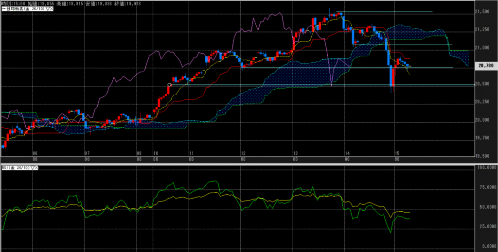 時間足_値位置(一目均衡表):20,500円で強めの陰線・陽線が往復したが、結局は弱含み三役暗転が継続。