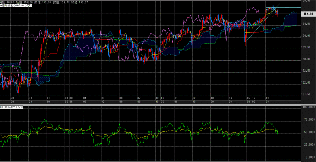 時間足_値位置(一目均衡表):155円を突破し、三役好転としているが、上値は重いが、下値も支えれる様子。
