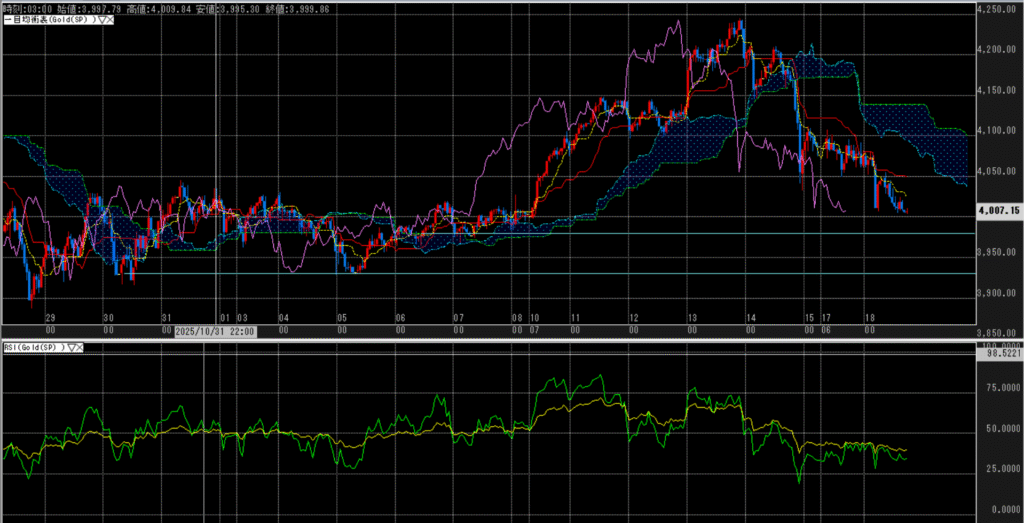 時間足_値位置(一目均衡表):4,050ドルを割り込み、三役暗転して、各線は弱い。4,000ドルを割り込む可能性が強く3,980ドル~3,930ドルを考えざるを得ないのか。