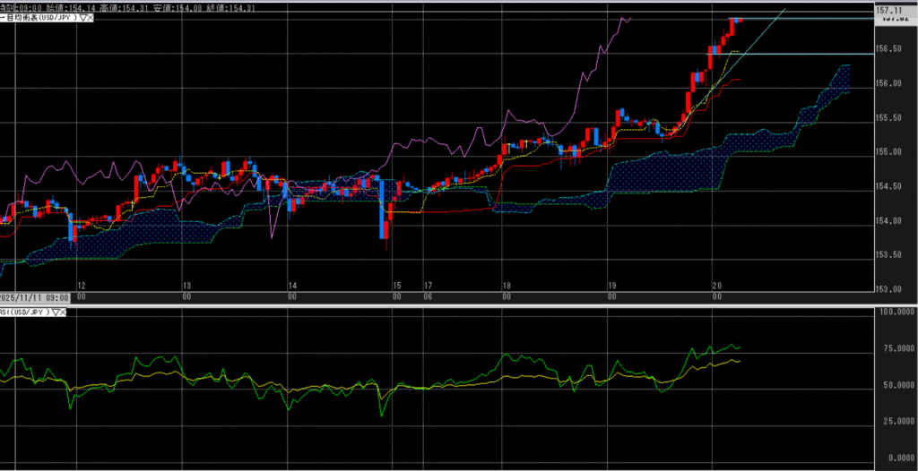 155円から157円までは、想定外の強さを見せ、各線との乖離/RSIに行き過ぎ感が見えている。
