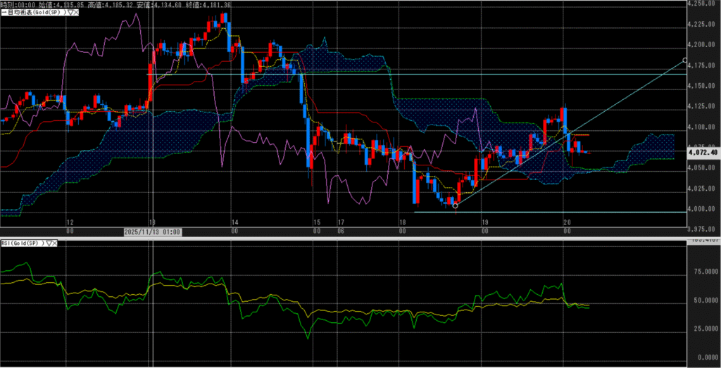 USD/JPYは確りしている中で、分足のドル建ては4,070~4,090ドルを雲の下で推移。