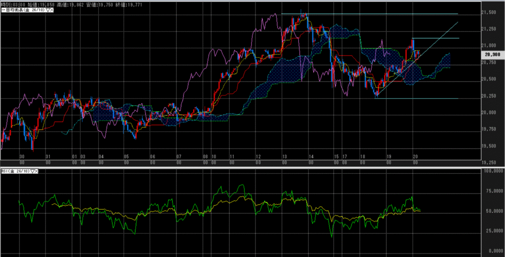 日足:転換・基準線のクロスが達成できず、遅行線は実体に支えられている様子。かなり微妙な値位置である。