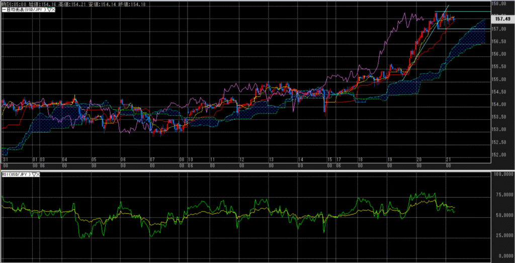 時間足_値位置(一目均衡表):157円以降、停滞気味で各線が収束しつつあるが、雲の流れは強く、弱い感はない。