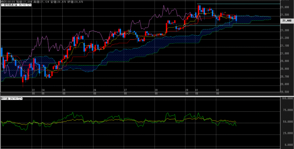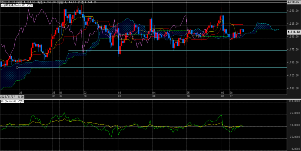 値位置(一目均衡表):10/21の特大陰線の仲値付近、時間足のレンジは4,170ドル~4,220ドルと言うのは変わらず、基準線を上にして、転換線との仲値に位置する。引けにかけて上昇するも本格化とは言い難い。
