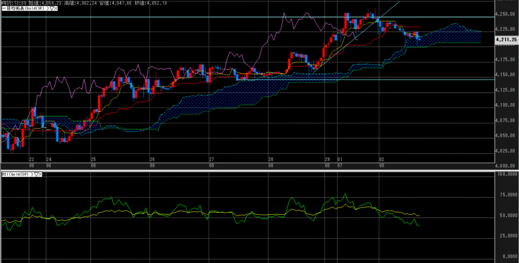 ドル建て金は4235ドルから4200ドル付近へ急落。ドル安一服による利食い売りが主因で、戻りは限られた。ドル円が155円後半で底堅いうえ、金は4200ドル台前半で軟調のため、円建て金には下押し圧力がかかりやすい状況となっている。