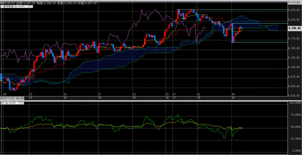 値位置(一目均衡表):日足は転換・基準線の仲値を小幅で往復、時間足は戻り基調だが、雲は強くない。